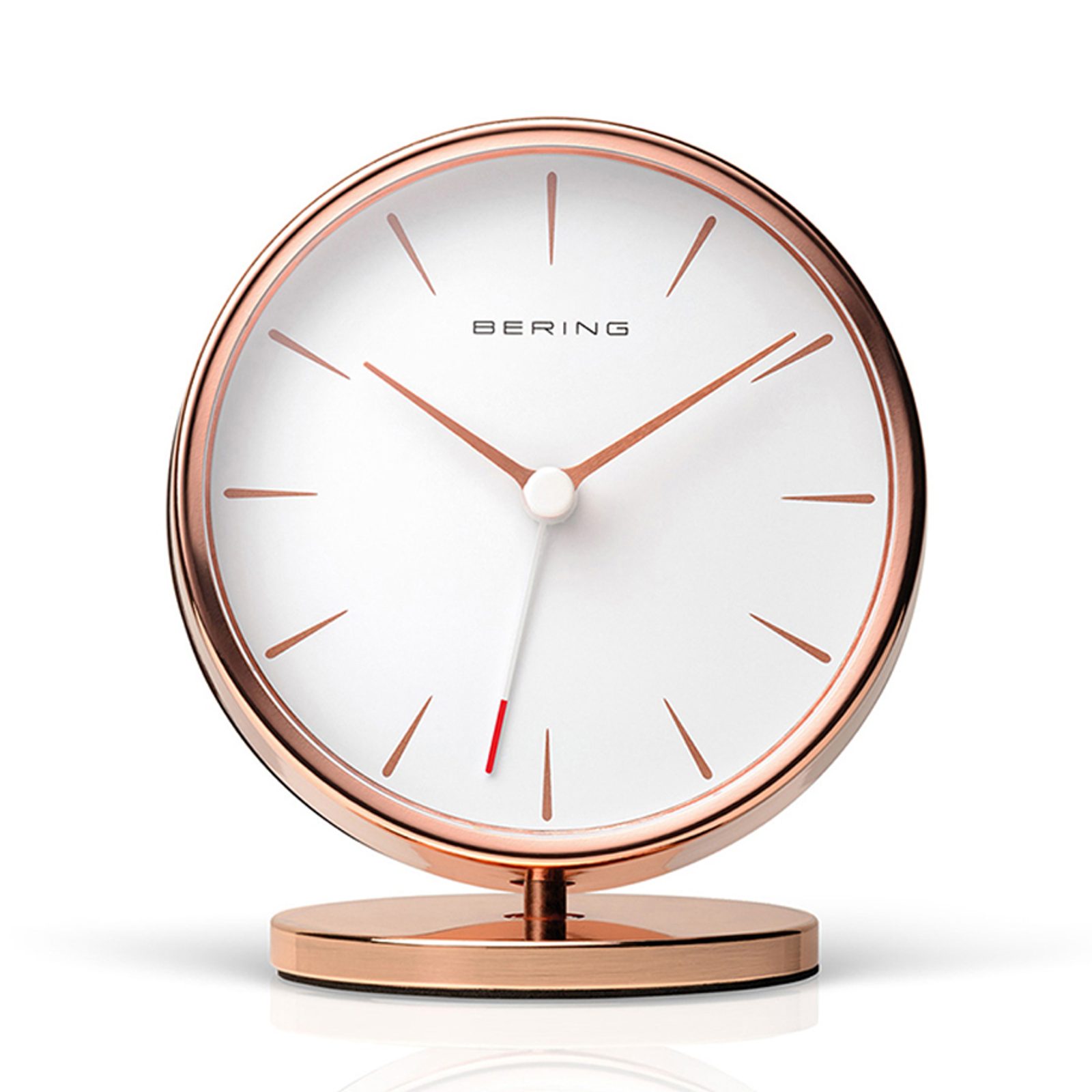 The Bering 91096-64R radio-controlled alarm clock is not only accurate, but also beautiful thanks to its minimalist Danish design. The white analogue dial with night light forms a contrasting background for the rose gold hands and indices. The white hand with red end shows the set wake-up time.
