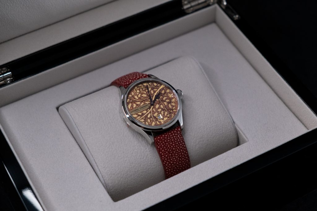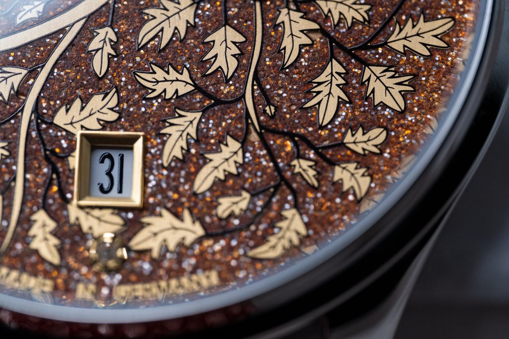 The case of the Autumn AS.LA-AMN-10 is made of stainless steel. Inside it is a Swiss mechanical movement with automatic winding ETA 2824 with a hand engraved and machined rotor. Its work can be observed thanks to the transparent sapphire crystal dial. The movement is set with 25 ruby stones and the power reserve is 38 hours. A handy date indicator is located at the 6 position. The dial is decorated with copper ornaments. Diamonds are set at positions 3 and 6. Everything is protected by a sapphire crystal and anti-reflective treatment.