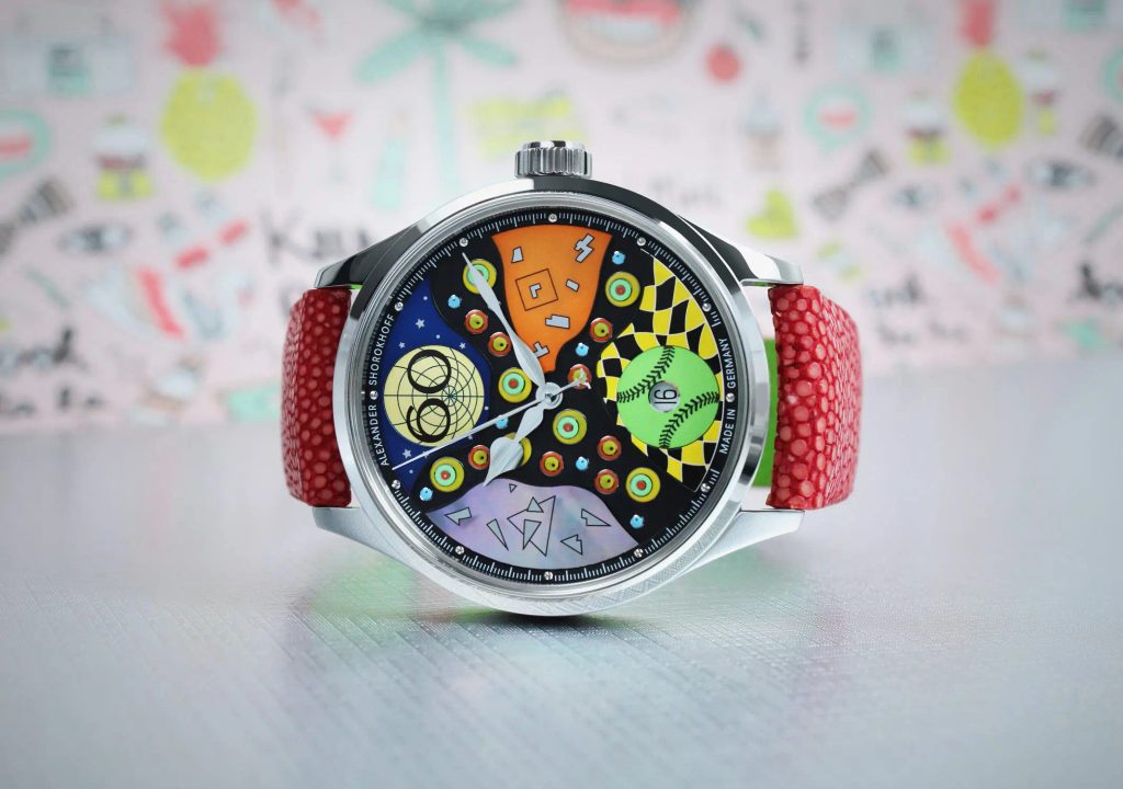 The remaining dial elements complete the whole composition with their unique shapes and colours. The dial consists of multiple layers, different applications and different materials such as mother-of-pearl, brass and multiple colours. In the end, everything harmonises and evokes a cheerful and positive emotion. Complementing the avant-garde and eccentric dial is the matching bracelet: a stingray leather strap in blue and red. The familiar look with the 39 mm stainless steel case and 5 ATM water resistance has been retained.