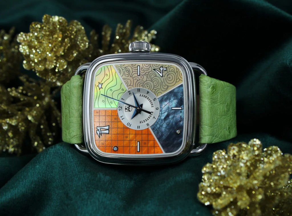 The Four Seasons AS.APV-4S watch measures 36 mm x 36 mm and has a mother-of-pearl dial finished in four colours. The dial design is avant-garde, with each colour symbolizing the seasons and representing a corresponding decorative design interpreted by designer Alexander Shorokhov. The green iridescent pearl represents spring and the awakening of nature. The lighter pearlescent area with circles symbolizes summer with an avant-garde depiction of flowers. The dark blue pearl represents winter and the orange represents autumn, symbolizing the change of nature.