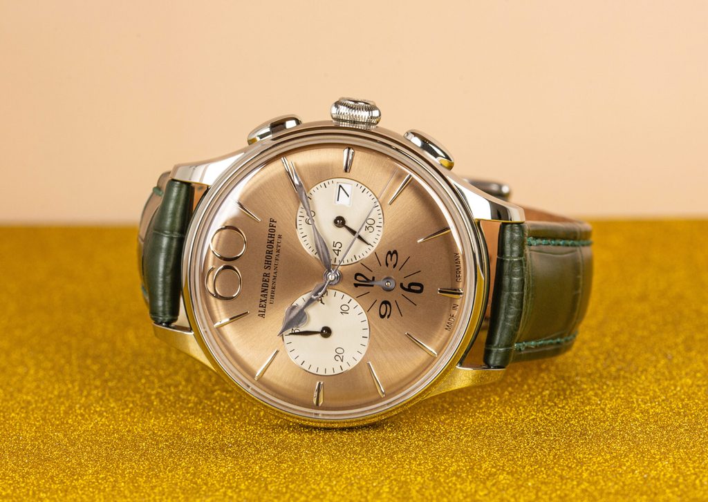 Limited to just two pieces, the "Goldy" model impresses not only with its design but also with its technology: inside is the prized ETA 2894 chronograph, extremely precise and with a total height of just 6.10 mm. It offers a stop function with a central seconds hand, a decentralised minutes display at the 9 o'clock position and an hour display at the 6 o'clock position. As with all Alexander Shorokhoff watches, the rotor is artistically engraved and hand-finished.