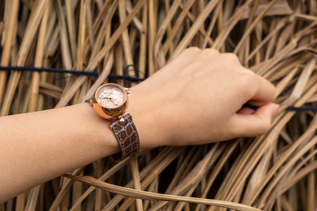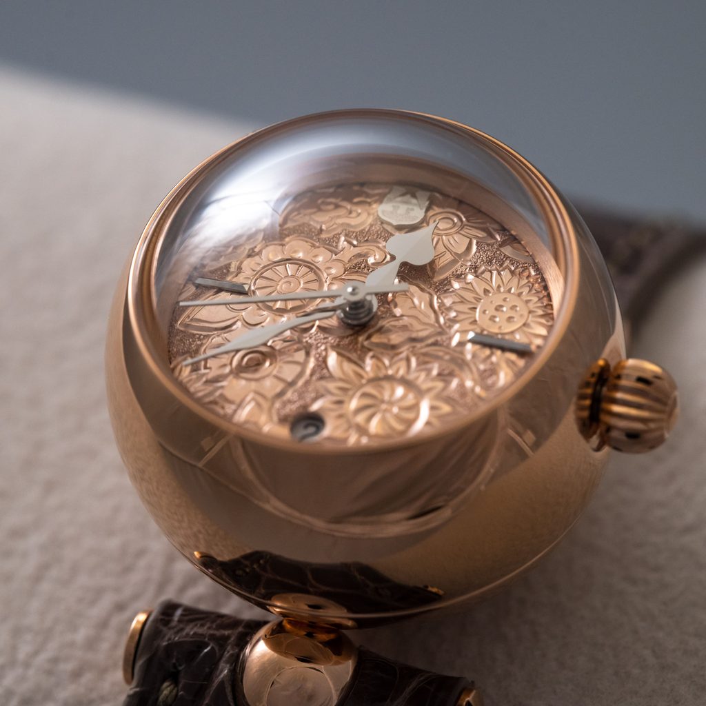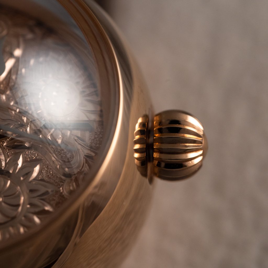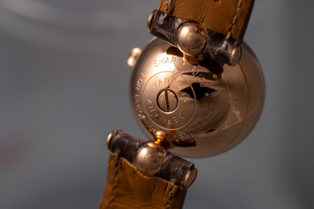 The case and sapphire crystal on the front are joined to form a sphere. In order to connect the bottom and body of the case without additional edges and holes, a single screw construction was developed. The screw is located in the centre of the base and connects the two parts. It also has a hemispherical shape that matches the overall shape. The sapphire crystal is perfectly matched to the spherical shape and fits into the case almost seamlessly.