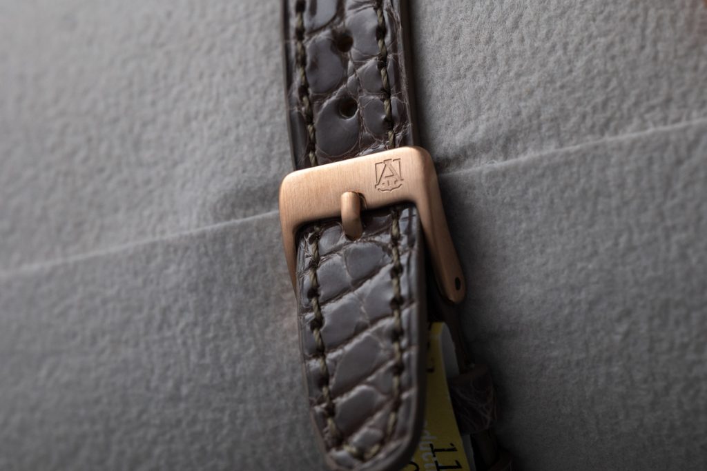 Inside the watch works a Swiss mechanical movement ETA.2671 with automatic winding. As usual with Alexander Shorokhoff, the movement rotor has been hand engraved. The gold-plated dial impresses with hand-engraved, floral motifs. A practical date display is then located at the 6 position. A soft and supple crocodile leather strap has been used for this model.