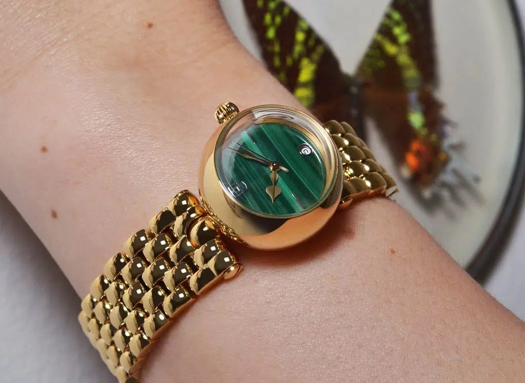 The spherical shape is close to perfection - without edges and corners, but also without beginning and end. Another successor to the new Shar wristwatch, which translates from Russian as "sphere", shines in a shiny gold case.