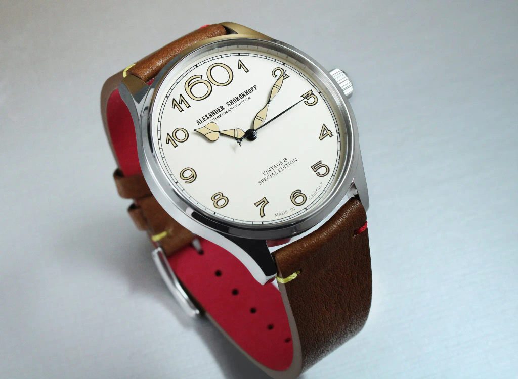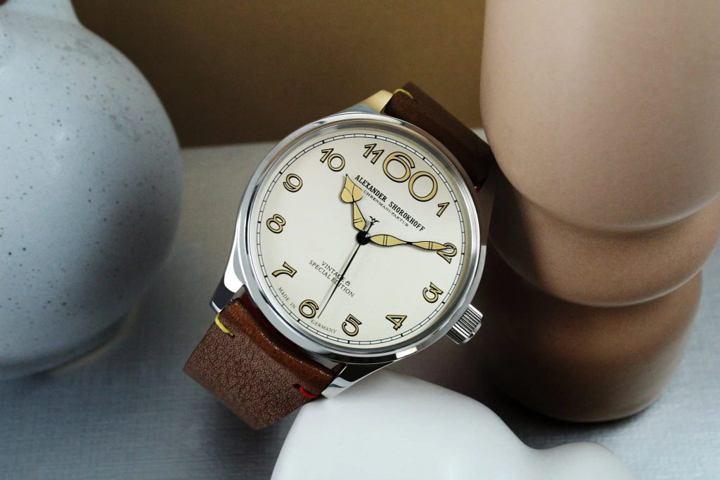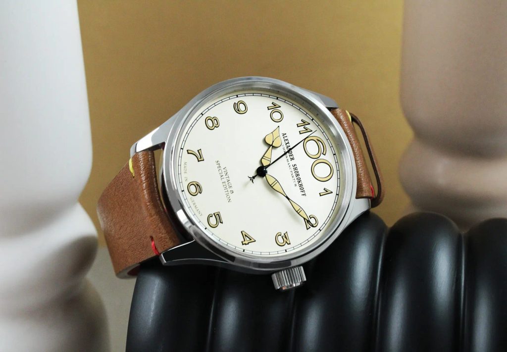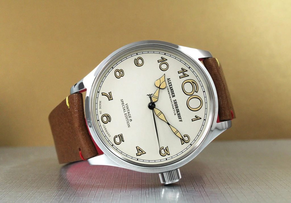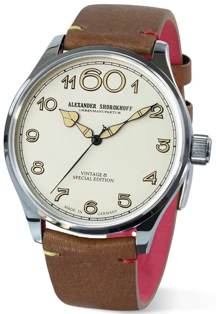 When we say Retro or Vintage, we mean the "good old days", which are supposed to be the opposite of today's hectic times. The new limited edition Alexander Shorokhoff Vintage 8 Plus model brings back the feeling of a bygone era. The main feature of this classic vintage-style watch is its numerals, authentically designed in the old retro/vintage style. The distinctive size of the number 60 is a hallmark of the brand, highlighting its affiliation with the avant-garde collection.