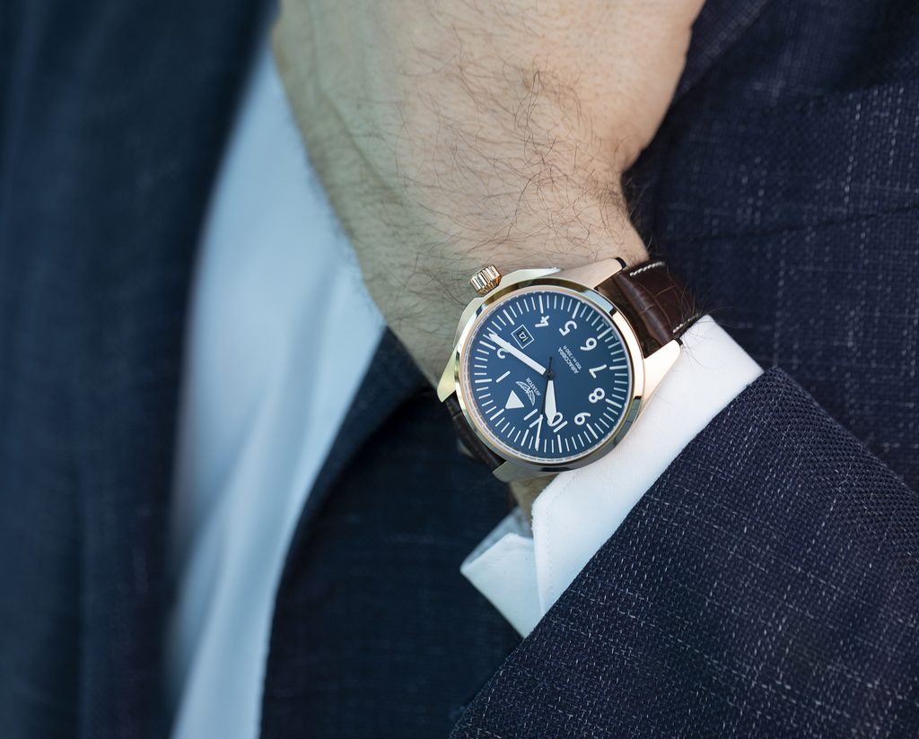 Designing each unique pilot's watch at the research and development facility inside the control tower of the regional airport in Jura, Switzerland, the staff looked to the heroes of the past, the dreamers of today and the innovators of tomorrow to organically combine the spirit of aviation in function and design. Aviator not only takes inspiration from the past, but works closely with professional pilots to design each watch to achieve flawless functionality in real-world flying conditions.