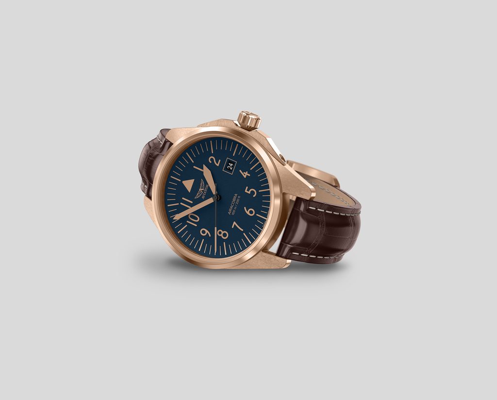 Designing each unique pilot's watch at the research and development facility inside the control tower of the regional airport in Jura, Switzerland, the staff looked to the heroes of the past, the dreamers of today and the innovators of tomorrow to organically combine the spirit of aviation in function and design. Aviator not only takes inspiration from the past, but works closely with professional pilots to design each watch to achieve flawless functionality in real-world flying conditions.