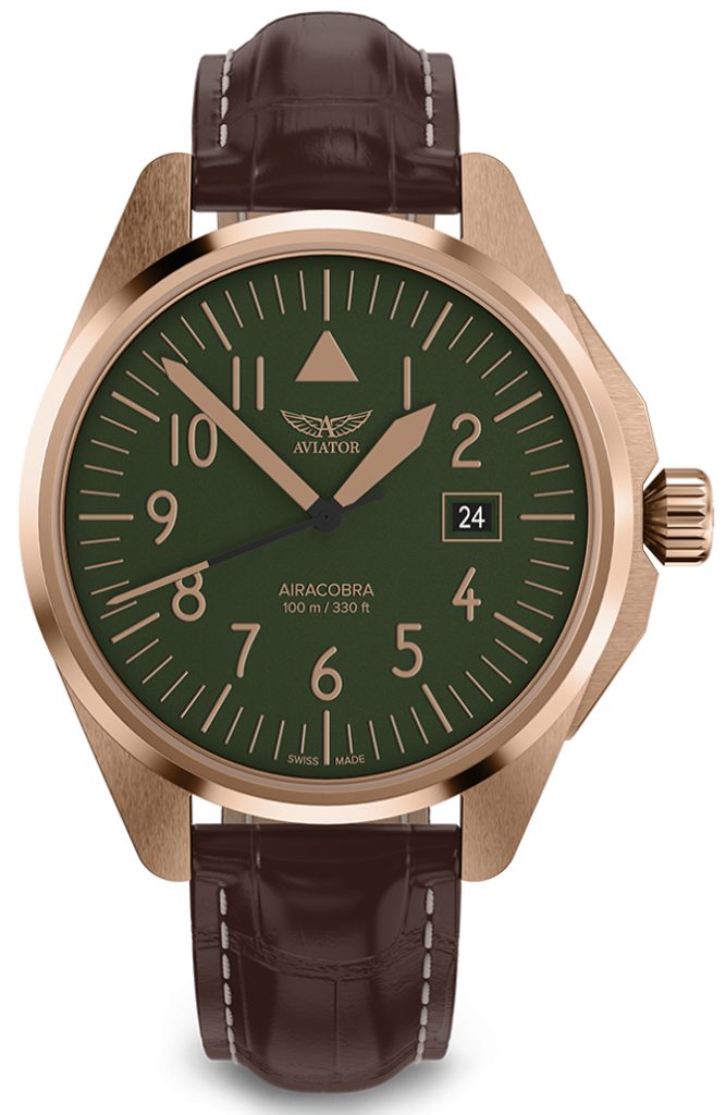 Reflecting a rugged, classic look with a cut and well-proportioned 42.8 millimeter case, the Aviator Airacobra's design is straight out of history. Its oversized screw-down crown offers a good grip, which is particularly advantageous when combined with authentic 1940s pilot's gloves. At the heart of the Aviator Airacobra 43 Type A V.1.38.2.330.4 is the Swiss Ronda 6003.D battery-powered movement.