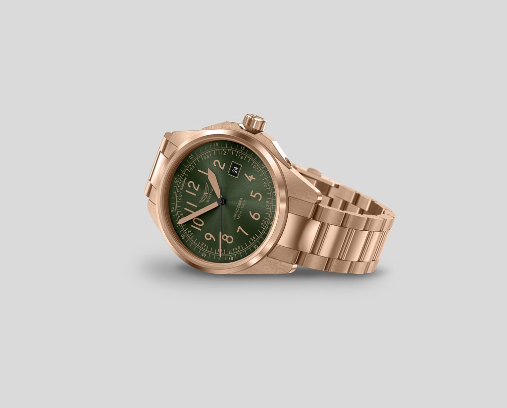 Reflecting a rugged, classic look with a cut and well-proportioned 42.8 millimeter case, the Aviator Airacobra's design is straight out of history. Its oversized screw-down crown offers a good grip, which is particularly advantageous when combined with authentic 1940s pilot's gloves. At the heart of the Aviator Airacobra 43 Type B V.1.38.2.329.5 is the Swiss Ronda 6003.D battery-powered movement.