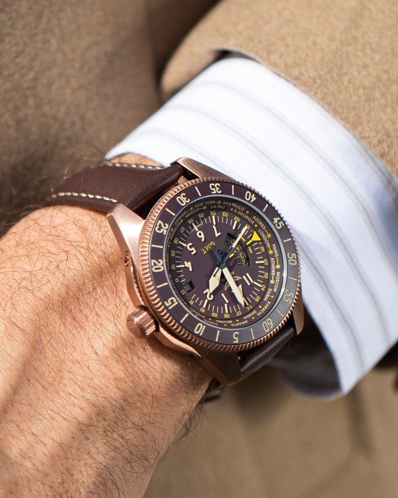 At the heart of the Aviator Airacobra GMT V.1.37.8.306.4 is the Swiss battery-powered AV-024 movement (the base is the Ronda 515.24D). The latter boasts practical functions such as the date at position 3 or a second time display in 24-hour format at position 9.