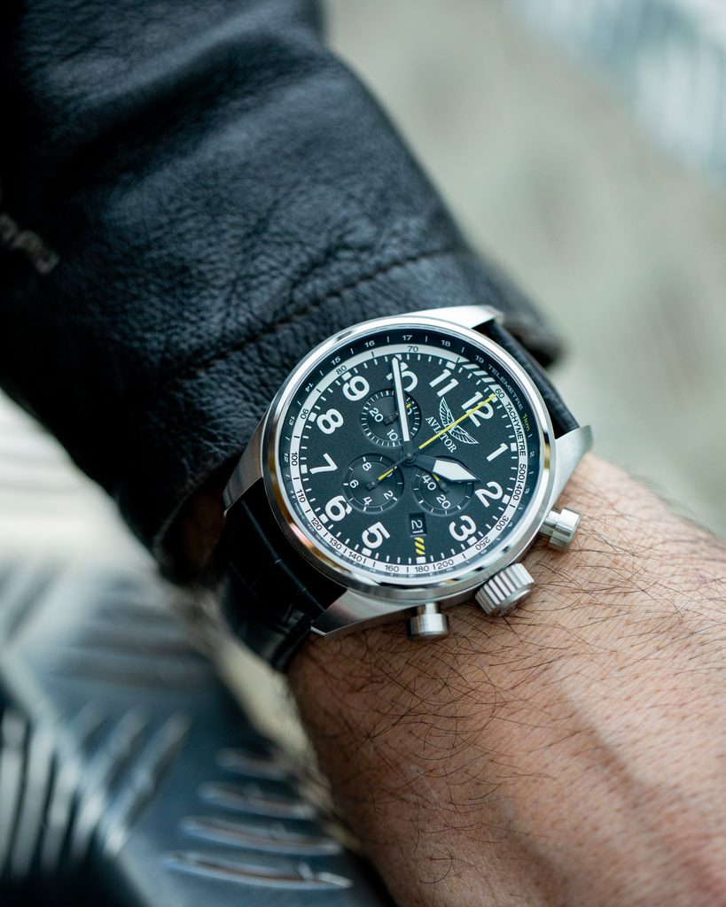 Designing each unique pilot's watch at the research and development facility inside the control tower of the regional airport in Jura, Switzerland, the staff looked to the heroes of the past, the dreamers of today and the innovators of tomorrow to organically combine the spirit of aviation in function and design. Aviator not only takes inspiration from the past, but works closely with professional pilots to design each watch to achieve flawless functionality in real-world flying conditions.
