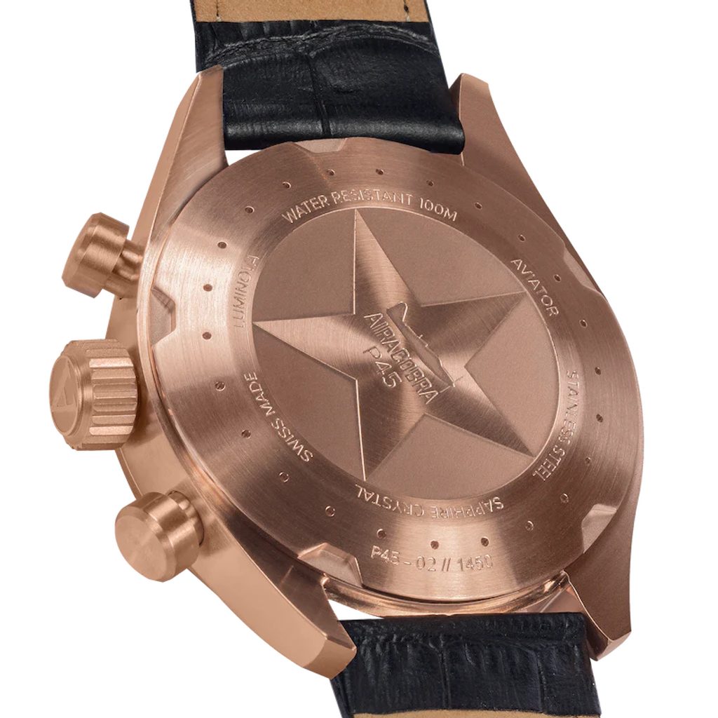 With a case diameter of 45 mm, the Aviator Airacobra P 45 Chrono V.2.25.2.173.4 is particularly suitable for fans of larger watches. The water resistance of 10 ATM indicates that this watch is a great companion not only in the air, but also while swimming in the water.