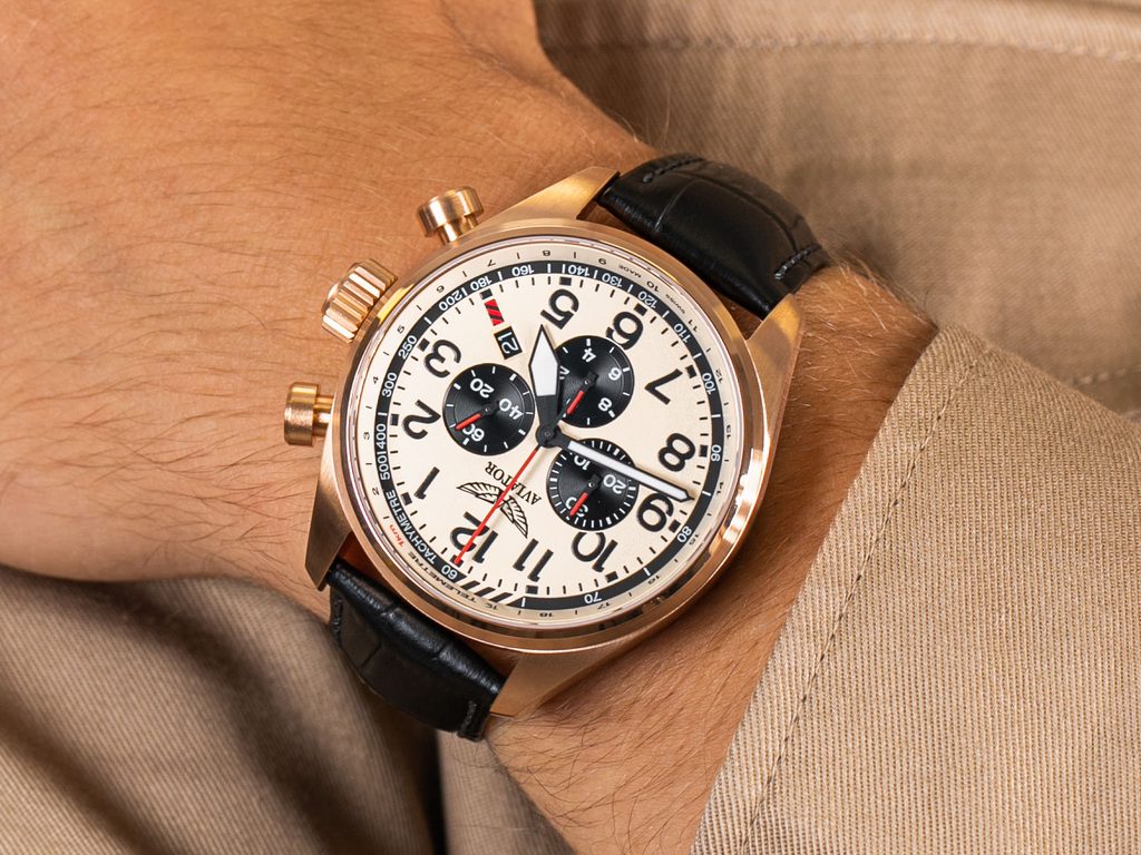 Reflecting a rugged, classic look with a cut and well-proportioned 45-millimeter case, the Aviator Airacobra's design is straight out of history. Its oversized screw-down crown offers a good grip, which is particularly advantageous when combined with authentic 1940s pilot's gloves. At the heart of the watch is the reliable Swiss battery-powered Ronda 5040 D movement , which is equipped with practical functions such as a stopwatch, date display, tachymeter and telemeter.