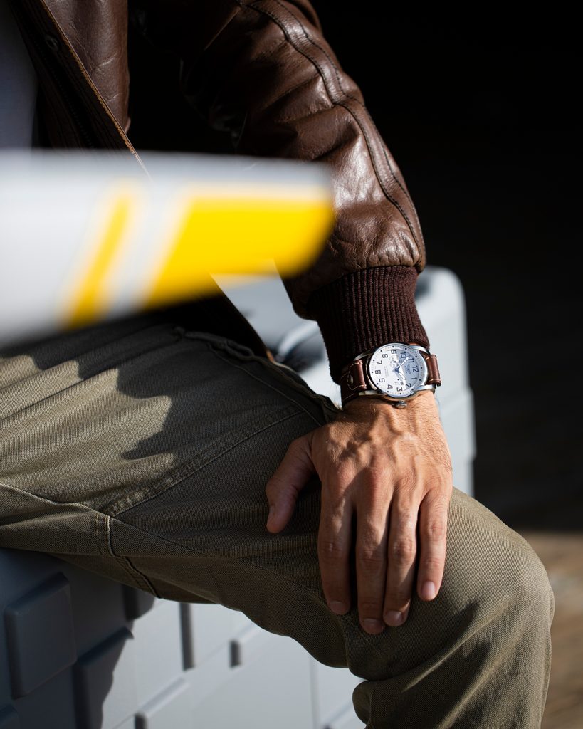 The large steel case of the Aviator Bristol Scout Automatic, rendered in the style of a pocket watch, reflects its historic past with remarkable dignity. Combined with the wide dial, it recalls the style of early pocket watches, which later had welded feet for strap attachment. The unique look of this model is also completed by the oversized crown with a deep pattern that provides a perfect grip even in the thickest pilot's gloves.