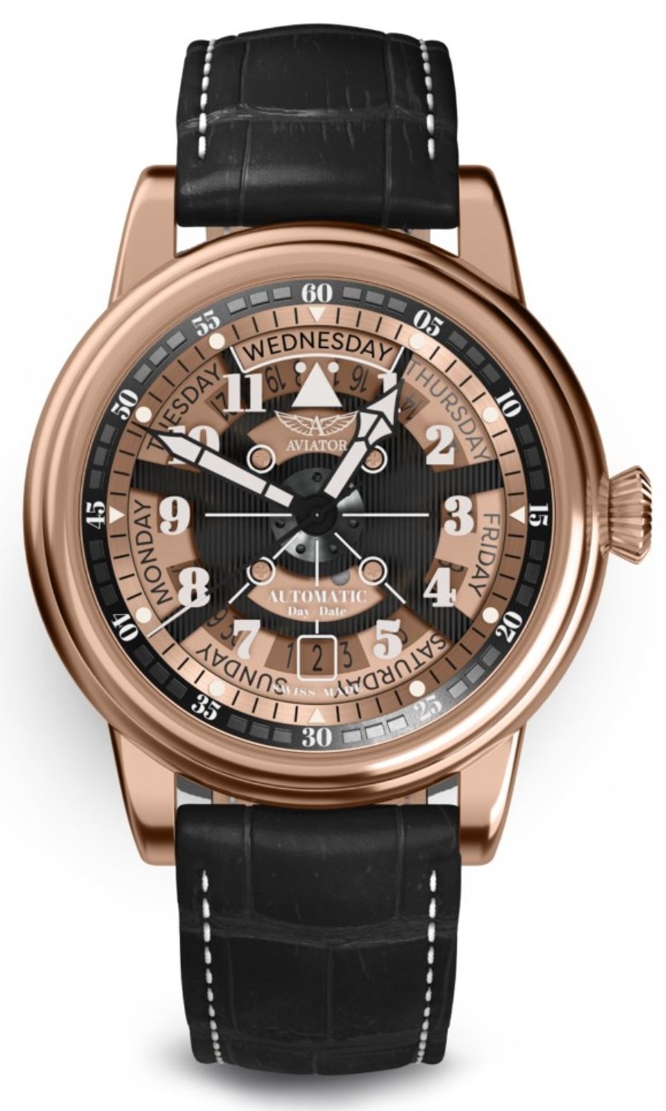 With its endurance, which allowed it to cover five hundred miles at a top speed of up to 170 miles per hour, the DC-3 enabled agile round-trip flights halfway around the world. The Aviator Douglas Day-Date Automatic Meca-41 watch captures the spirit of outdoor adventure with a touch of vintage style. Its innovative design, sleek lines, glossy styling accents and luxurious curves penetrate the very heart of the aircraft - the engine. Every component, gear, bolt and nut inside is set to the movements of the aircraft's radial engine, which is supported by a propeller that cuts through the air.