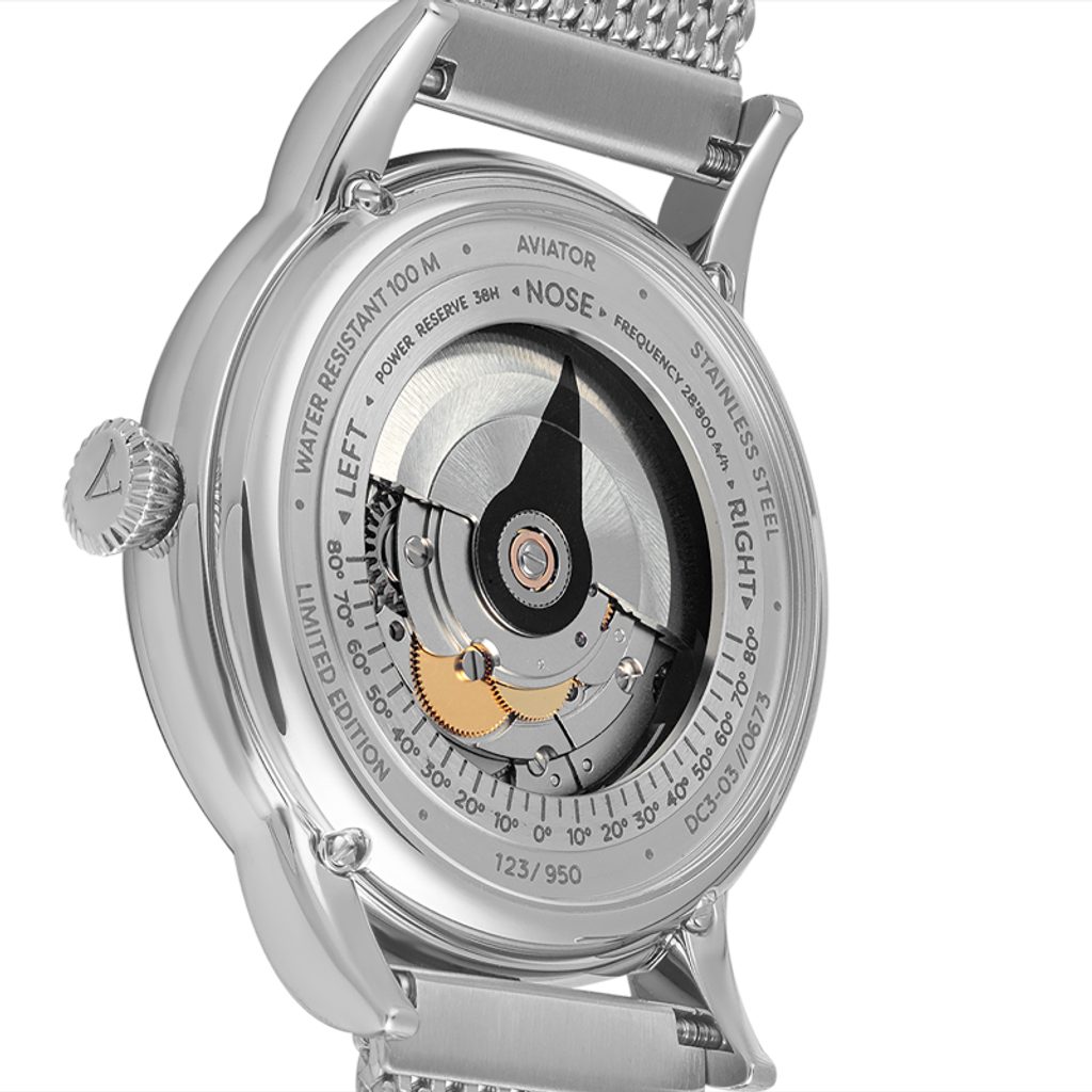 Designing each unique pilot's watch at the research and development facility inside the control tower of the regional airport in Jura, Switzerland, the staff looked to the heroes of the past, the dreamers of today and the innovators of tomorrow to organically combine the spirit of aviation in function and design. Aviator not only takes inspiration from the past, but works closely with professional pilots to design each watch to achieve flawless functionality in real-world flying conditions.