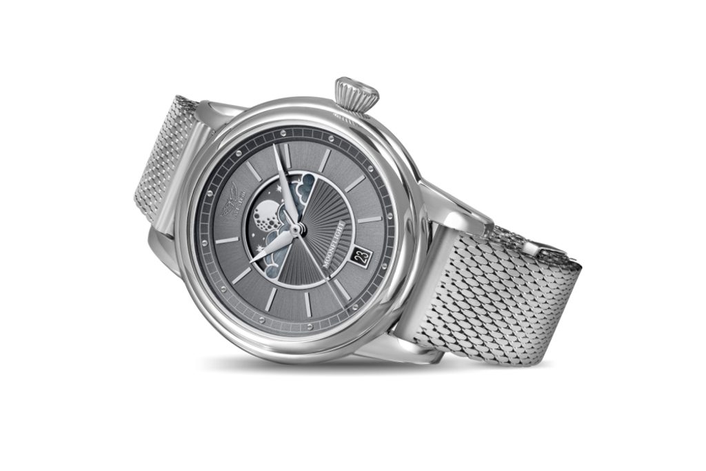 No one doubts the influence of the moon on our earth and all life on it anymore. It influences our sleep and our thinking, or the rise and fall of the oceans and seas. During the 8 phases that the moon goes through every 29.5 days, the intensity of its power changes. The Aviator Moonflightwomen's watch is designed so that you can track these phases at any time by looking at your watch.