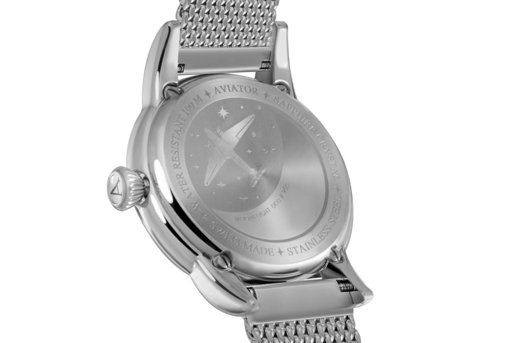 The case of the Aviator Douglas Moonflight V.1.33.0.261.5 is made of stainless steel. Hand-finished using fine watchmaking techniques, its rounded curves are inspired by the graceful sophistication of the Douglas aircraft fuselage.