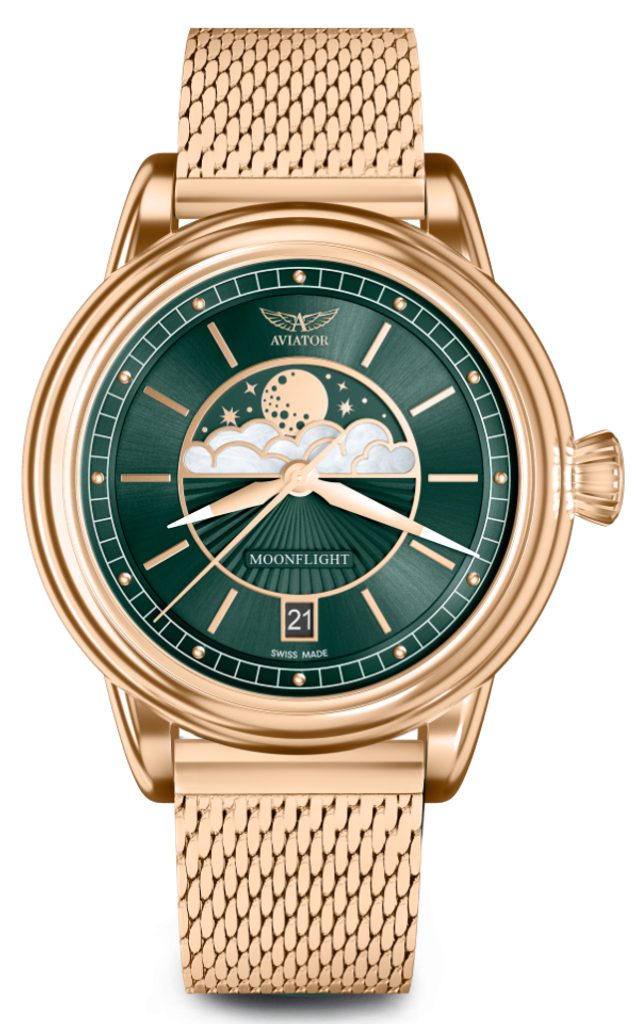 The golden age of aviation brought a new level of sophistication to travel. Fashion designers brought extravagance and art to the design of steel aircraft and cabin crew uniforms. Night flights aboard Douglas DC-3 aircraft offered luxurious amenities and the spectacular mystique of the moon outside the windows - from sunset to sunrise. Inspired by this era of luxury and the mysterious allure of the moon, Aviator MoonFlight brings elegance to your fingertips. The colour palette, glossy smooth surfaces and sun guilloches are very 1930s indeed. Clouds made of pure mother-of-pearl evoke beautiful simplicity with a touch of flapper fashion, while a mesmerizing disc of moon phases captures the night sky as it shone many moons ago and will continue to shine.