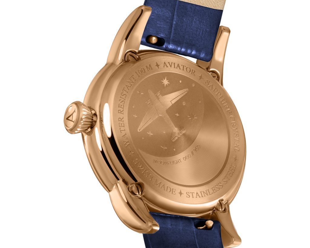 The case of the Aviator Douglas Moonflight V.1.33.2.380.4 is made of stainless steel with a gold PVD finish. Hand-finished using fine watchmaking techniques, its rounded curves are inspired by the graceful sophistication of the Douglas aircraft fuselage.