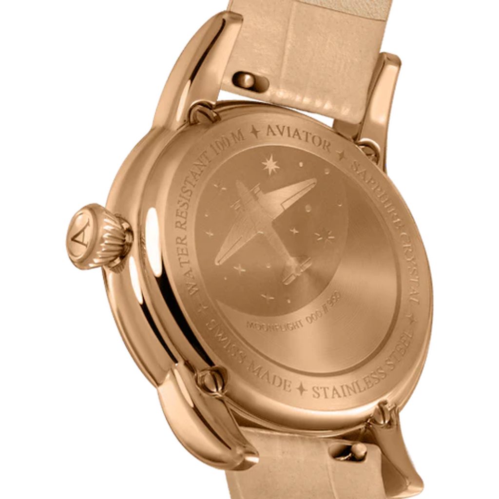 The case of the Aviator Douglas Moonflight V.1.33.2.383.4 is made of stainless steel with a gold PVD finish. Hand-finished using fine watchmaking techniques, its rounded curves are inspired by the graceful sophistication of the Douglas aircraft fuselage.