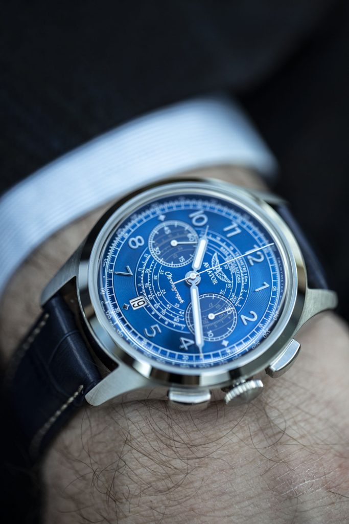 Designing each unique pilot's watch at the research and development facility inside the control tower of the regional airport in Jura, Switzerland, the staff looked to the heroes of the past, the dreamers of today and the innovators of tomorrow to organically combine the spirit of aviation in function and design. Aviator not only takes inspiration from the past, but works closely with professional pilots to design each watch to achieve flawless functionality in real-world flying conditions.