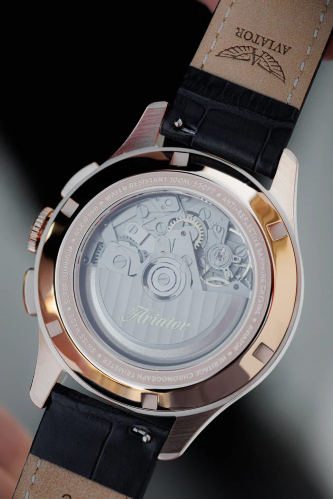 Designing each unique pilot's watch at the research and development facility inside the control tower of the regional airport in Jura, Switzerland, the staff looked to the heroes of the past, the dreamers of today and the innovators of tomorrow to organically combine the spirit of aviation in function and design. Aviator not only takes inspiration from the past, but works closely with professional pilots to design each watch to achieve flawless functionality in real-world flying conditions.