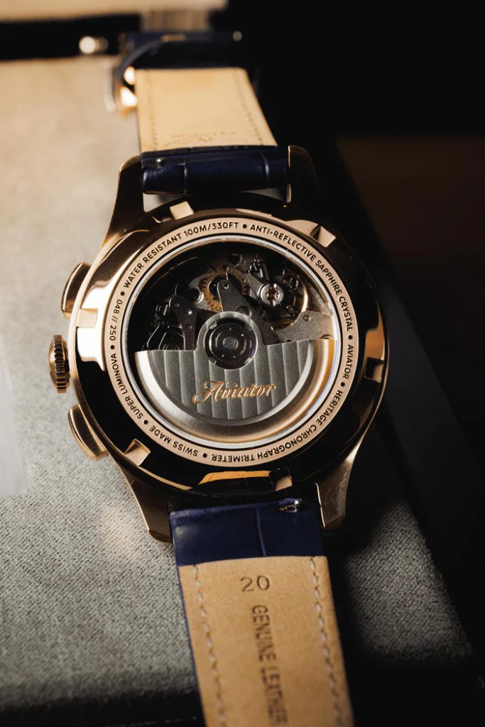 Designing each unique pilot's watch at the research and development facility inside the control tower of the regional airport in Jura, Switzerland, the staff looked to the heroes of the past, the dreamers of today and the innovators of tomorrow to organically combine the spirit of aviation in function and design. Aviator not only takes inspiration from the past, but works closely with professional pilots to design each watch to achieve flawless functionality in real-world flying conditions.