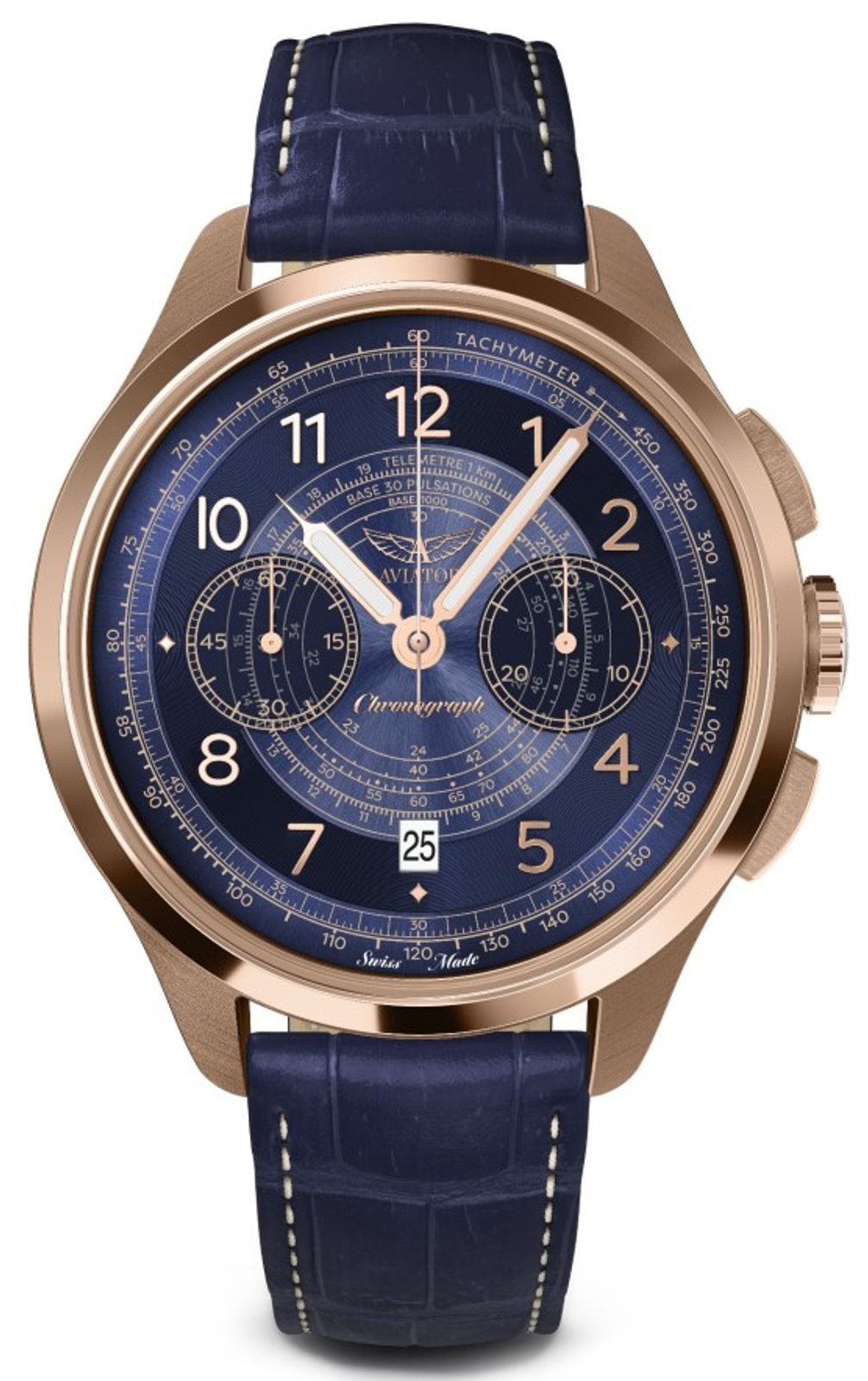 With a case diameter of 43 mm, the Aviator Heritage Chronograph Trimeter Automatic V.4.40.2.357.4 fits most men's wrists. Water resistance of 10 ATM indicates that the watch will be a great companion not only in the air, but also when swimming in the water.