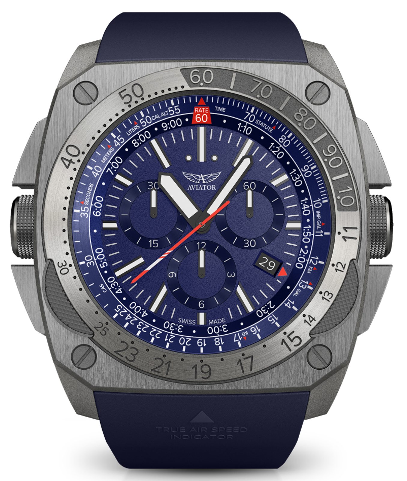 Designing each unique pilot's watch at the research and development facility inside the control tower of the regional airport in Jura, Switzerland, the staff looked to the heroes of the past, the dreamers of today and the innovators of tomorrow to organically combine the spirit of aviation in function and design. Aviator not only takes inspiration from the past, but works closely with professional pilots to design each watch to achieve flawless functionality in real-world flying conditions.