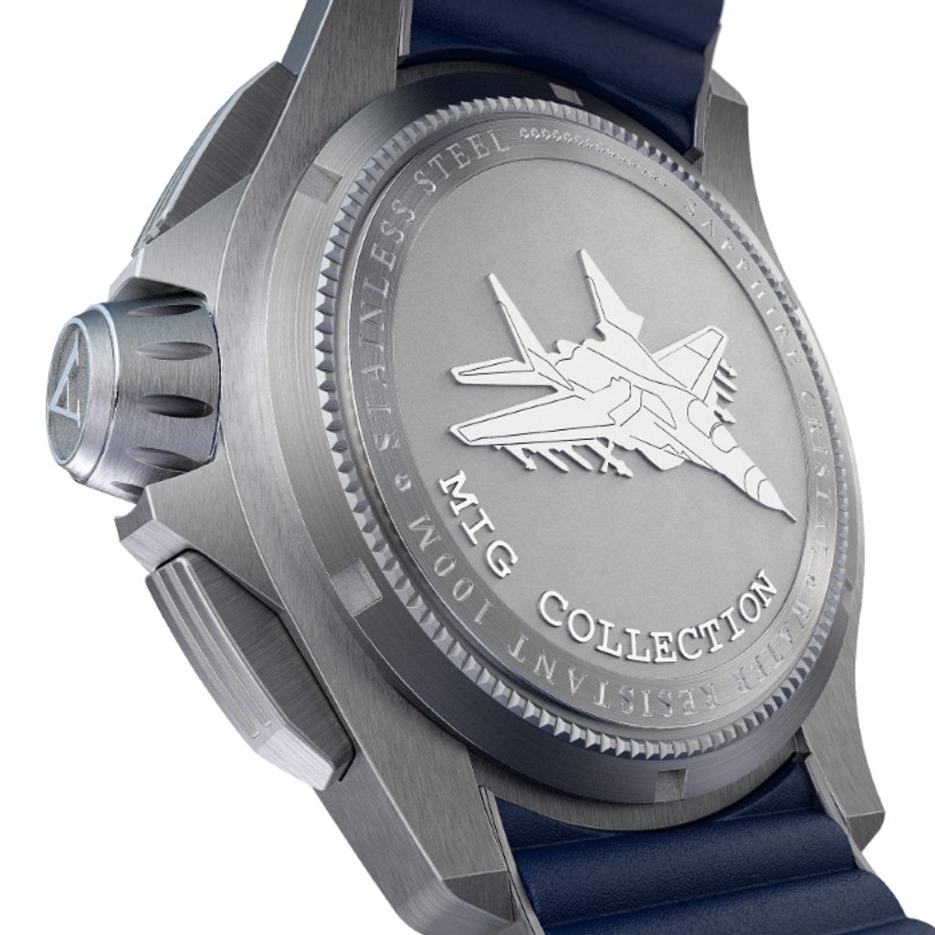 The MiG-35 Chrono watch is a tribute to the latest generation of fighter aircraft. A number of key aesthetic details are directly inspired by this fighter: the finely brushed case centre and pushers evoke the aerodynamic curves of the fuselage, while the crown evokes the shape of a jet engine; the ribbed rubber band is a direct reference to the oxygen tube used in high-altitude flights.