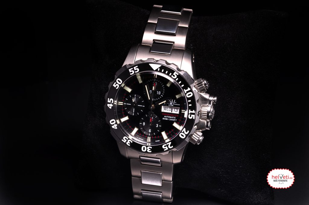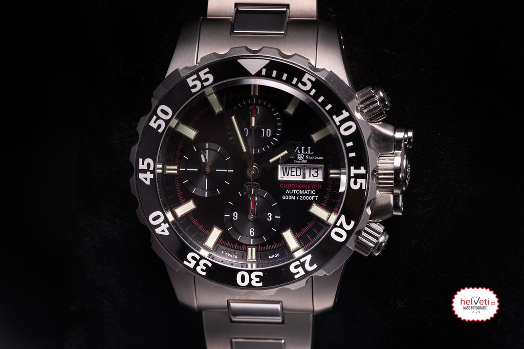 The case of the Ball DC3026A-SC-BK is made of titanium, the bracelet is made in a combination of titanium and steel. The bracelet also includes a patented folding clasp. Inside the case, the Ball RR1402-C Swiss mechanical automatic movement (based on the ETA Valjoux 7750) operates at 28,800 semi-frequencies per hour and is COSC certified. As a result, it can carry the "Chronometer" designation and meets the most stringent requirements for running accuracy. This movement has a chronograph function, i.e. a stopwatch. The large central seconds hand serves as a stopwatch, the sub-dial at 12 o'clock houses the minute counter, while the sub-dial at 6 o'clock serves as the hour counter. Unlike the vast majority of stopwatches with stopwatches, these stopwatches can also be used underwater, demonstrating Ball's considerable technological maturity. At the traditional 3 o'clock position we then find the date and day of the week display .