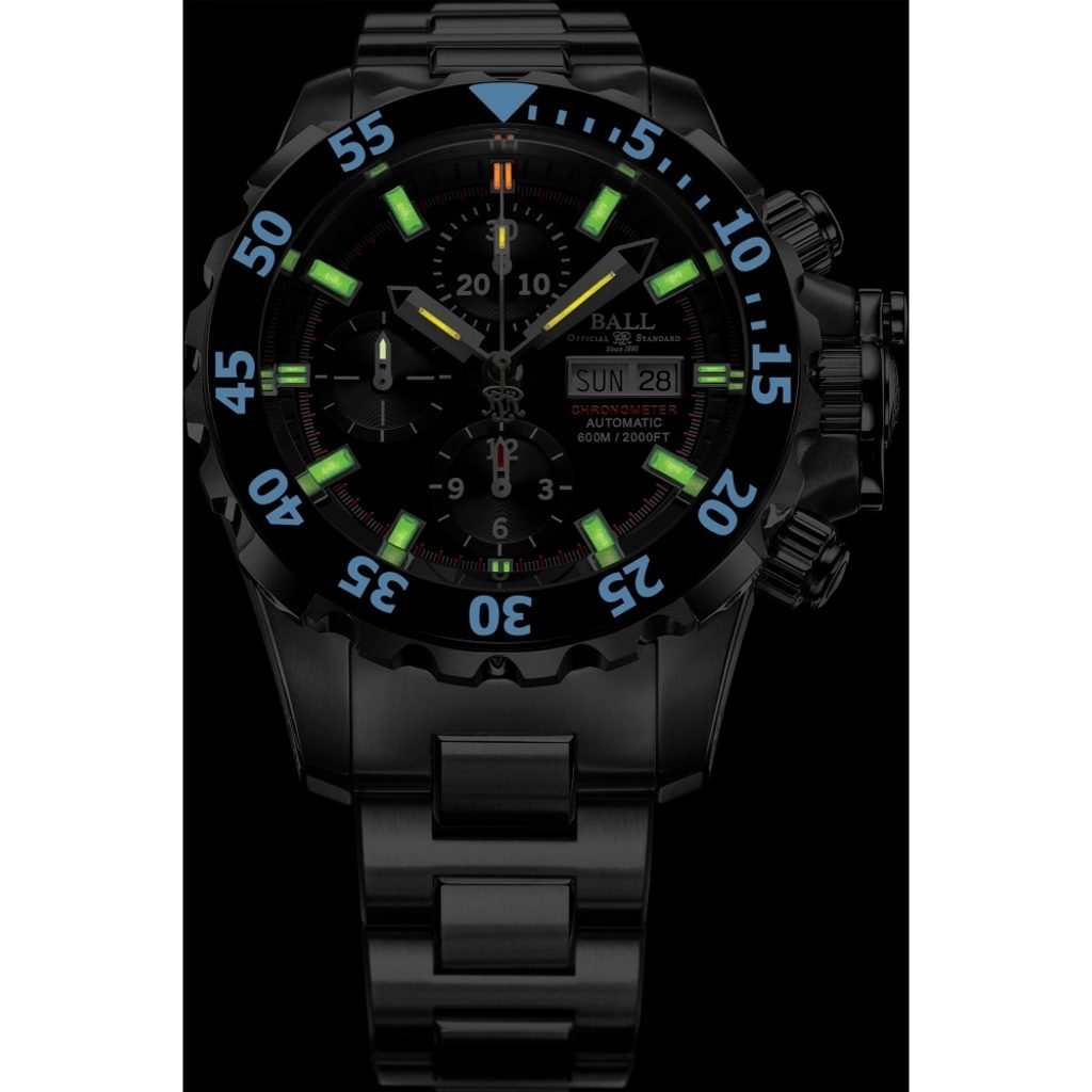 The case of the Ball DC3226A-P6C-BE is made of Grade 5 Titanium (which is more resistant to scratches), the strap is rubber. Inside the case works a Swiss mechanical automatic movement Ball RR1402-C (the basis is ETA Valjoux 7750), which works at a frequency of 28800 semi-frequencies per hour and has COSC certification. As a result, it can carry the "Chronometer" designation and meets the most stringent requirements for running accuracy. This movement has a chronograph function, i.e. a stopwatch. The large central seconds hand serves as a stopwatch, the sub-dial at 12 o'clock houses the minute counter, while the sub-dial at 6 o'clock serves as the hour counter. Unlike the vast majority of stopwatches with stopwatches, these stopwatches can also be used underwater, demonstrating Ball's considerable technological maturity. At the traditional 3 position, we then find the date and day of the week display .