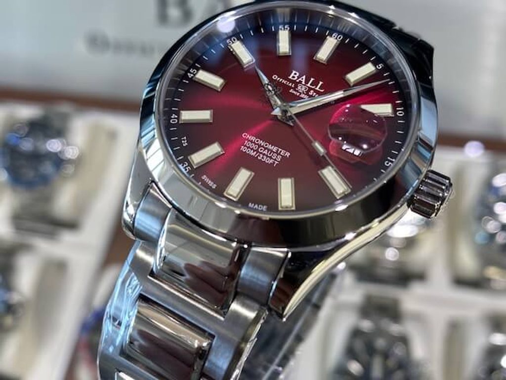 The case of the Ball NM9026C-S6CJ-RD watch, including the bracelet, is made of 904L stainless steel, which requires special processing techniques and guarantees increased resistance to corrosion and acids. Inside this case, the Swiss mechanical automatic movement Ball RR1103-C (based on the ETA 2824 or Sellita SW200) operates at a frequency of 28,800 semi-frequencies per hour and is COSC certified. As a result, it can carry the "Chronometer" designation and meets the most stringent requirements for running accuracy. At the traditional position 3 we find the date display, highlighted by a magnifying glass (the so-called cyclops).