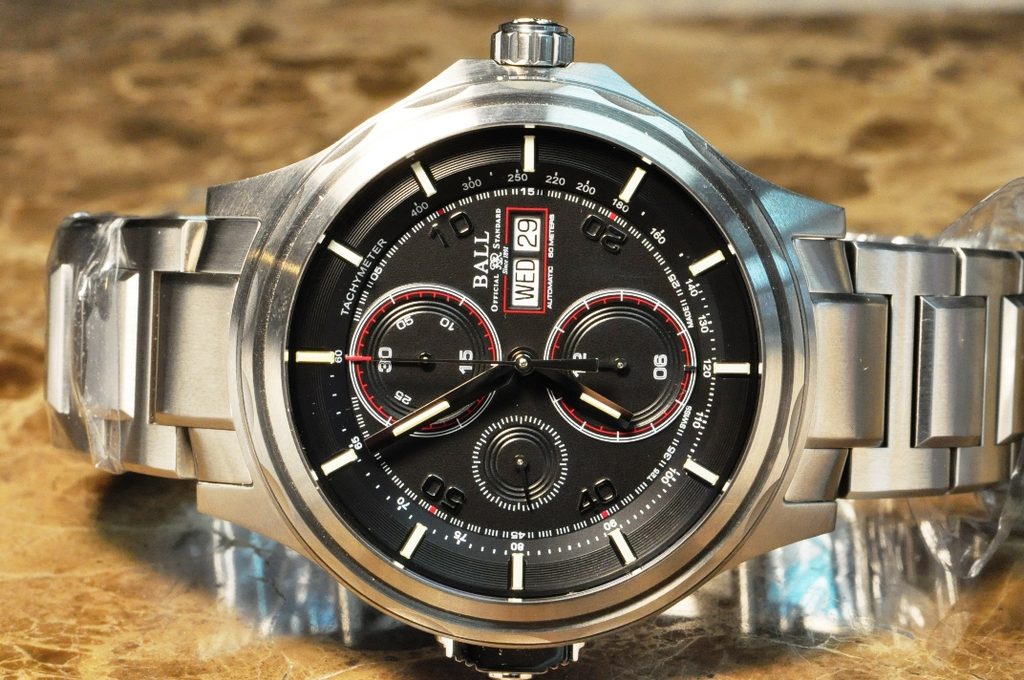 The case of the Ball CM3888D-S1J-BK including the bracelet is made of stainless steel, the bracelet is made in a combination of titanium and steel. The bracelet also includes a patented folding clasp. Inside the case, a Swiss mechanical automatic Ball RR1402 movement (based on the ETA Valjoux 7750) operates at a frequency of 28,800 semi-frequencies per hour. This movement has a chronograph function, i.e. a stopwatch. The large central seconds hand serves as the stopwatch, the sub-dial at the 12 o'clock position houses the minute counter, while the sub-dial at the 6 o'clock position serves as the hour counter. These stopwatches use the patented Slide Chronograph technology. Thanks to it, the stopwatch can be operated by a sliding mechanism at the 9 o'clock position and can thus be operated with one finger. At the traditional 3 o'clock position we then find the date and day of the week display .