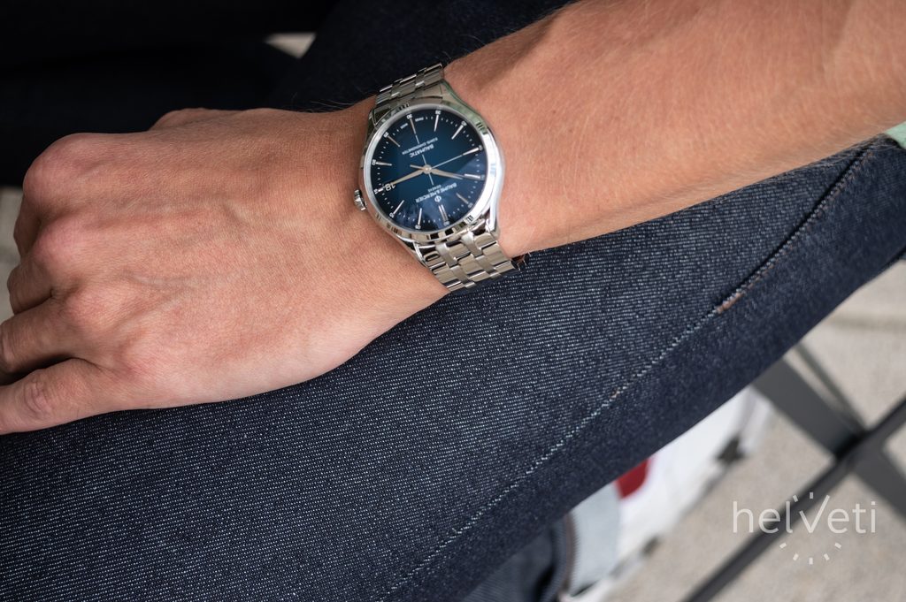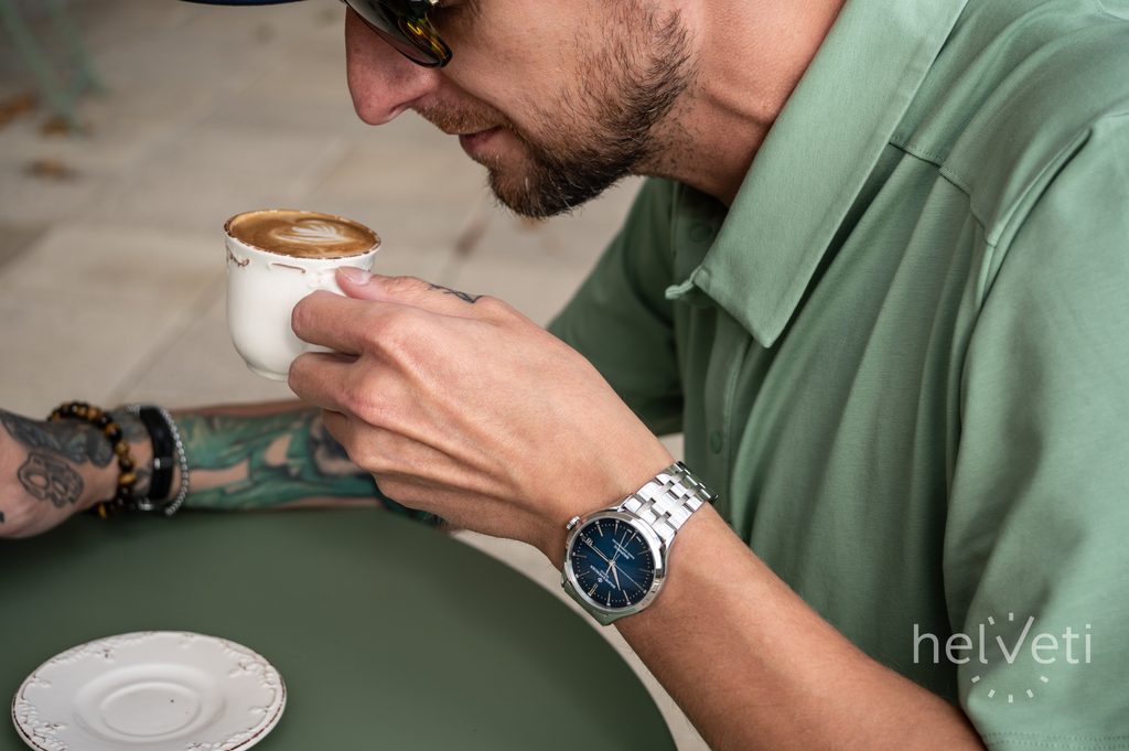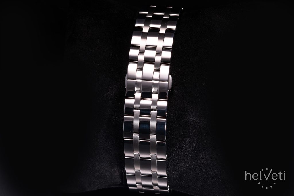 The steel case of the watch is complemented by a five-row steel bracelet finished with a butterfly clasp. It is the integrated bracelet that promotes the sporty feel of the watch, and it is also equipped with a quick-release system, which makes it very easy to change without tools.