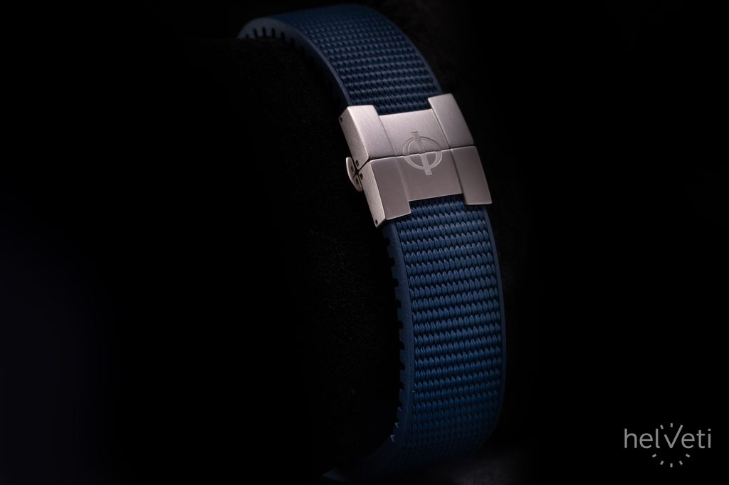 The steel case of the watch is complemented by a blue rubber strap with a canvas pattern, finished with a butterfly clasp. The integrated strap supports the sporty touch of the watch, and it is equipped with a quick-release system, which makes it very easy to change without tools.
