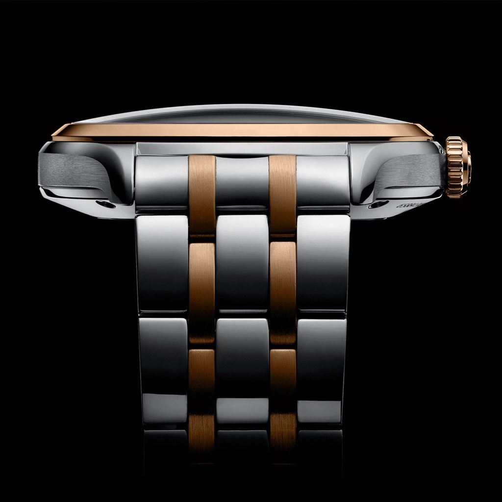The steel case of the watch is complemented by a five-row steel bracelet with a butterfly clasp. The case and bracelet are decorated with gold-plated elements in the form of a lunette, crown and parts. The integrated bracelet promotes the sporty touch of the watch, and it is equipped with a quick-release system, which makes it very easy to change without tools.