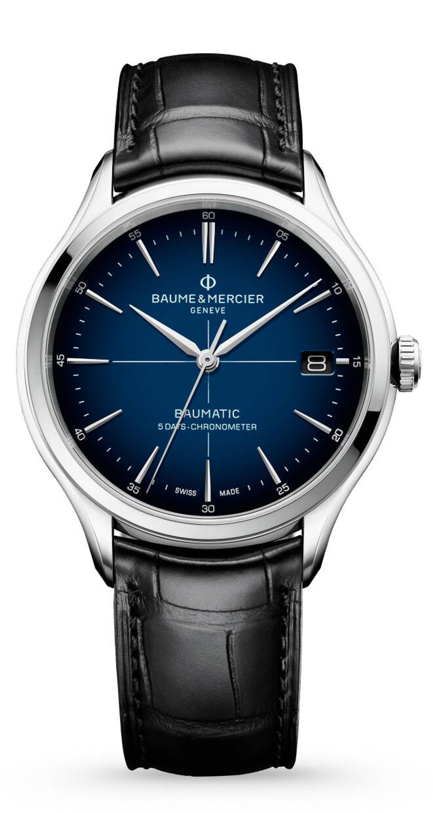 Baume & Mercier Clifton M0A10467 has a lacquered blue dial that transitions to darker shades from the centre towards the edges. Contrasting silver alpha hands and embossed needle indexes at the hour positions ensure clarity. The watch is powered by the in-house-made Baumatic BM13-1975A COSC mechanical movement with an impressive power reserve of 120 hours. The self-winding movement with a frequency of 28,800 semi-frequencies per hour offers a crown winding option, a stop-seconds function when setting the time (hacking) and a practical date function at the classic 3 o'clock position. The movement delights with COSC certification and running accuracy of just -4 to +6 s/d.