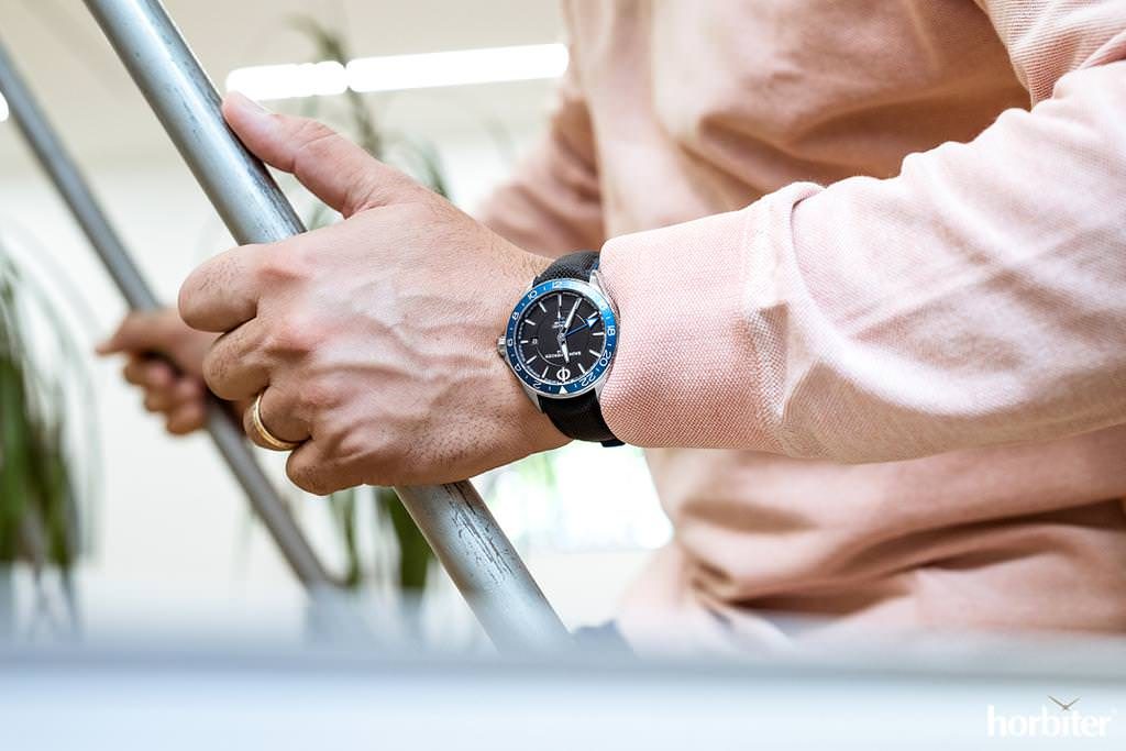 The movement is powered by a Swiss mechanical movement with automatic winding ETA 2893-2 with a power reserve of around 42 hours. The movement with a frequency of 28,800 semi-frequencies per hour offers the possibility of winding by crown, the function of stopping the seconds hand when setting the time (hacking) and date at the 3 o'clock position and, of course, the GMT function - display of the second time zone. For the date display, the black background of the date wreath is pleasing.