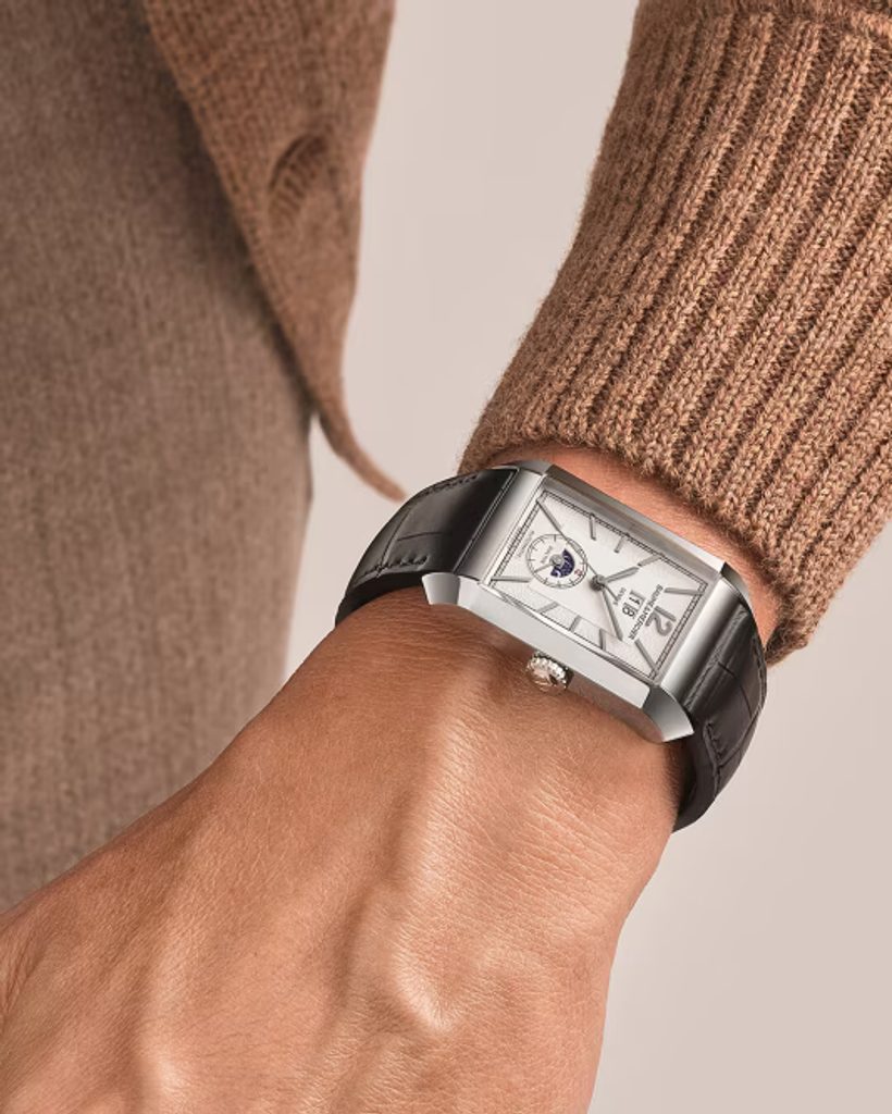 The elegance of this watch is enhanced by the rectangular shape of the case and the detailed workmanship that makes it a jewel. The steel case is complemented by a black alligator strap finished with a butterfly clasp. Another nice detail is the fact that the strap extends all the way down to the case. In addition, the leather strap is equipped with a quick-release system, making it very easy to change without tools. The water resistance of this model is 50 m. The size of the case is an ideal 48 mm x 31 mm for most men's wrists.