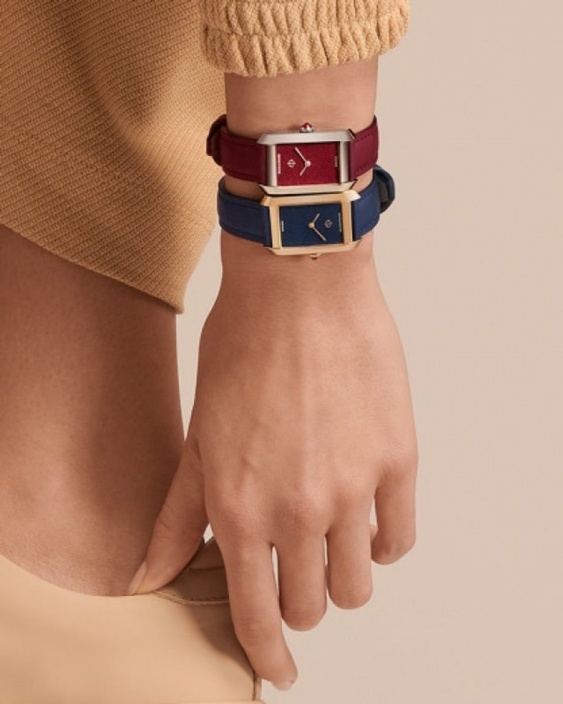 The watch face, whose subtle shimmer is achieved by lacquer coating, is protected by a sapphire crystal with high scratch resistance. The elegance of this watch is enhanced by the rectangular shape of the case, the detailed workmanship and the red cabochon set into the crown, which makes the watch a jewel. The steel case is complemented by a burgundy red calfskin strap finished with a thorn clasp. The leather strap is also equipped with a quick-release system, making its eventual replacement very easy without the use of tools. The water resistance of this model is 50 m. The dimensions of the case are an ideal 34.9 mm in height and 22 mm in width for women's wrists.