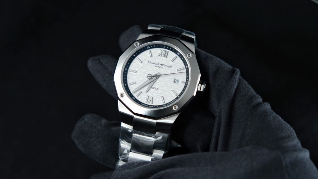 The Baume & Mercier Riviera M0A10829 model has a white dial with a typical wave-like structure and sunburst effect, complemented by a contrasting black bezel with a minute scale placed around the perimeter of the dial. The harmonious two-tone design is also completed by the combination of silver applied indices, rhodium-plated hands and a black seconds hand with Phi logo on the counterweight. The black and white design represents the balance, harmony and beauty of life's contrasts.