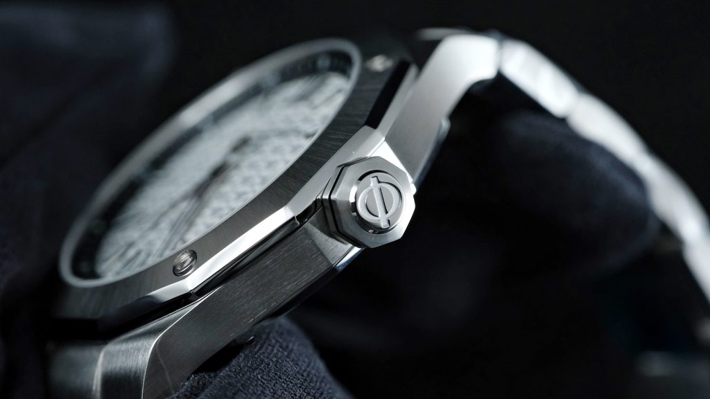 The steel case of the watch is complemented by a three-row steel bracelet finished with a butterfly clasp. It is the 4 functional screws in the lunette, the satin finish and the integrated bracelet that support the sporty touch of the watch. In addition, the bracelet is equipped with a quick-release system, making it very easy to change without tools.