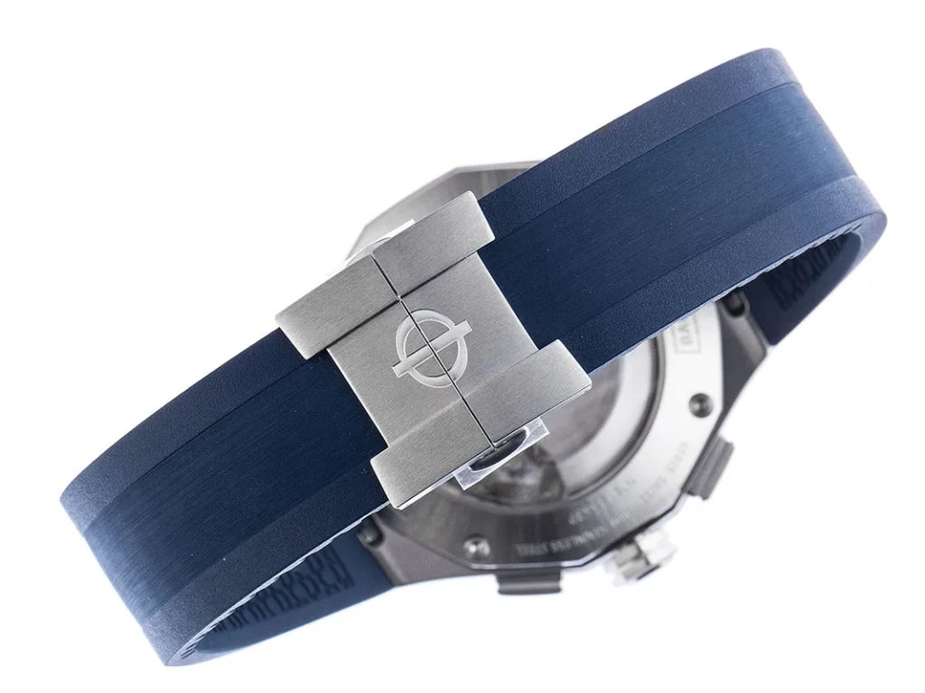 The steel case of the watch is complemented by a blue rubber strap, finished with a butterfly clasp. It is the 4 functional screws in the lunette, the satin-finished case and the integrated strap that support the sporty touch of the watch. The strap is equipped with a quick-release system, making it easy to change without tools.