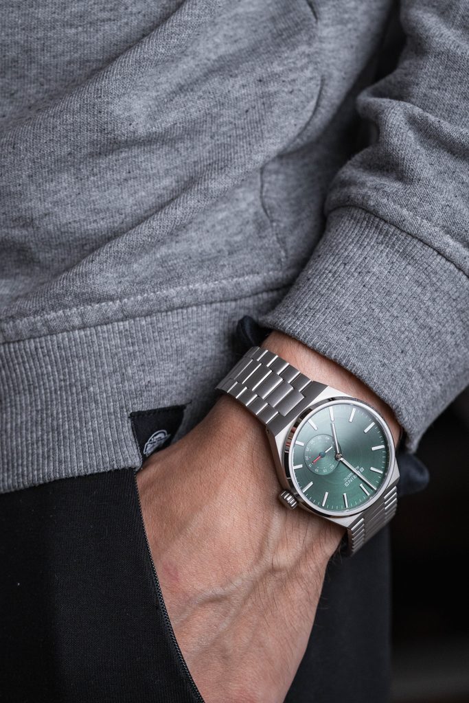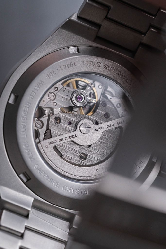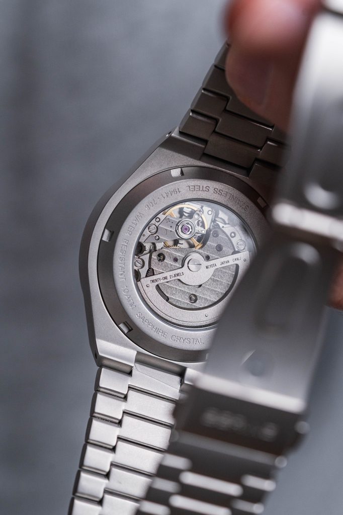 An interesting feature of this watch, apart from the automatic winding, is the sight glass on the movement, which completes the overall great design.