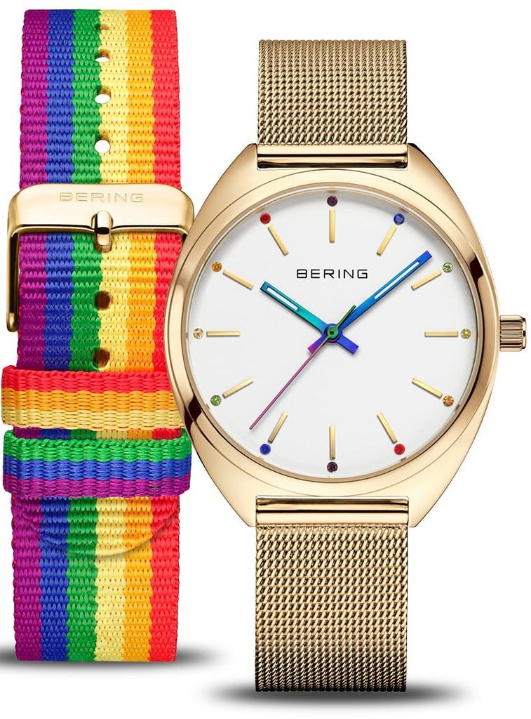 The watch stays on the wrist thanks to a braided stainless steel bracelet in gold colour, which is equipped with a classic buckle clasp. In addition, the watch comes with an additional NATO bracelet in rainbow colours, which you can conveniently change thanks to the quick-release system. You will receive the model in specially designed, thematically coordinated packaging that emphasizes the collection's message and makes unpacking a unique experience.