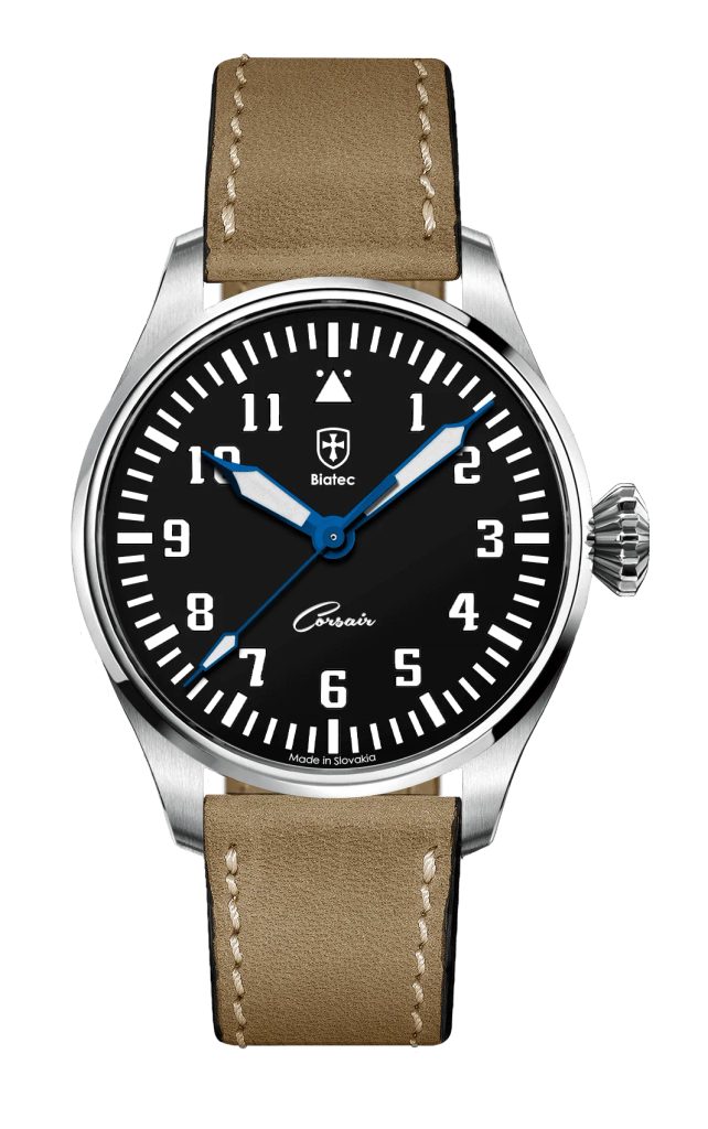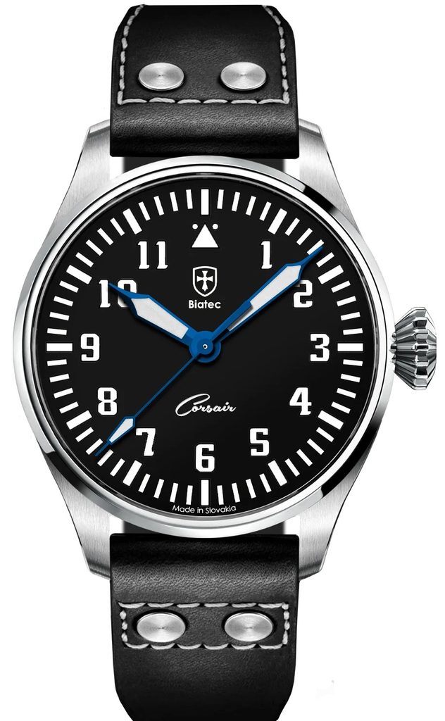The Biatec Corsair Vintage 01 watch belongs to the Corsair pilot watch collection. It impresses especially with its typical pilot watch design and large crown.