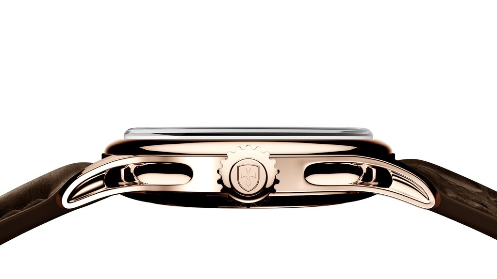 The watch case is made of polished stainless steel with a rose gold PVD finish and its diameter is a pleasant 38 mm, the length (lug-to-lug) is 46 mm, so the watch fits well on most wrists. The large crown with the Biatec logo allows comfortable operation of the hands.