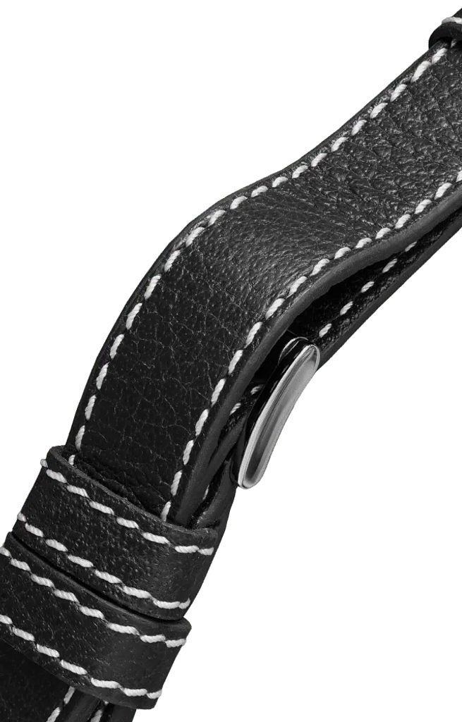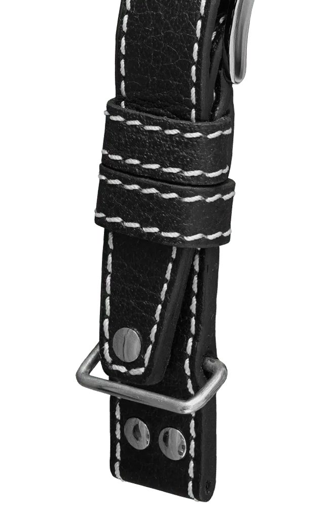 The black Biatec genuine buffaloleather strap in pilot style is characterised by its robustness and high durability. Its sporty design is accentuated by polished rivets and a steel strap.